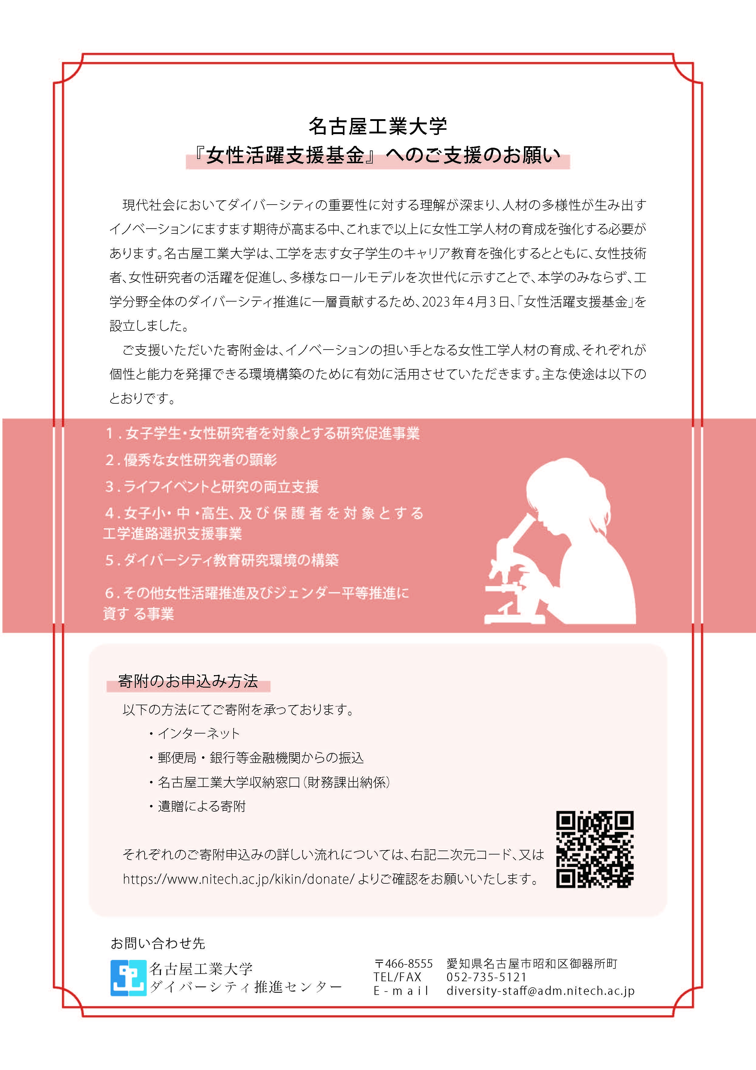 ご支援いただいた寄附金は、イノベーションの担い手となる女性工学人材の育成、それぞれが個性と能力を発揮できる環境構築のために有効に活用いたします。