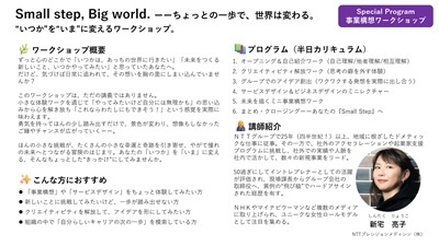 事業構想ワークショップ Small step, Big world. ビジネスという手段で、未来のストーリーを自分たちで創っていく取組みです。 発想を"ひねり出す"より"つなぎ直す" いまあるものを組み合わせることで、新しい価値が生まれるーー。 そんな体験を、ワークを通じて一緒に楽しみましょう。 講師:新宅亮子氏 NTTプレシジョンメディシン(株) (ご参考)「マイナビウーマン」新宅亮子さんインタビュー |