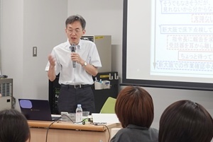 まず、名古屋工業大学大学院 鷲見克典教授が「コミュニケーションの基本スキルを考える」と題し、対人コミュニケーションにおける重要な視点について講義を行いました。 情報の行き違いを防ぐ手法「クローズドループ・コミュニケーション(復唱によって理解を確認する方法)」が紹介され、実際の事故事例をもとにその有効性と必要性が解説されました。